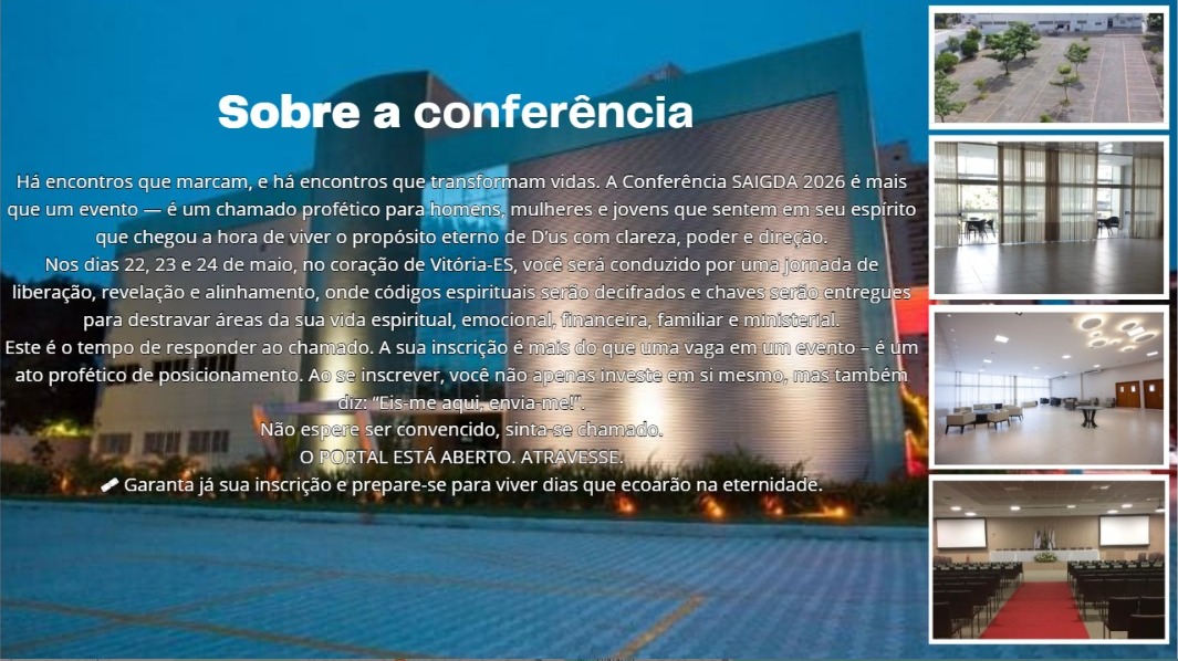 O Vitória Grand Hall, localizado na Rua Dr. João Carlos de Souza, 55 – Santa Luiza, Vitória/ES, é o espaço que escolhemos para a nossa conferência. O local oferece uma estrutura moderna, ampla e bem equipada, ideal para receber todos os participantes com conforto e praticidade. Além de estar no coração de Vitória, o acesso é fácil e conveniente.